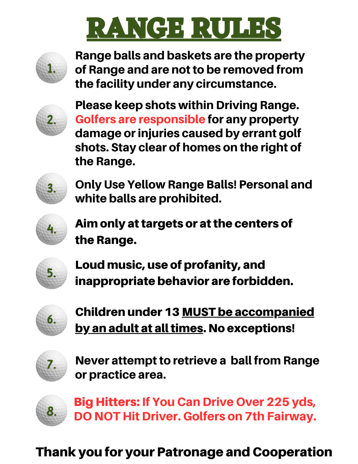 We’re very happy to have you practicing and playing on our range. In order to make sure everyone can enjoy the facility and to ensure everyone’s safety, please take a second to read the rules below before your next range session. Thanks – Dan Lock.
